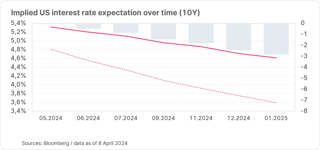 US Federal Reserve Chairman Jerome Powell, whose mandate essentially comprises price stability and maximising employment in the USA, will probably have to continue to exercise patience. The course is still set for a reversal of interest rates, although the interest rate markets have already reacted in recent months. While seven interest rate cuts were expected over the course of 2024 at the turn of the year, only two to three interest rate cuts are currently being priced in, as shown below.
