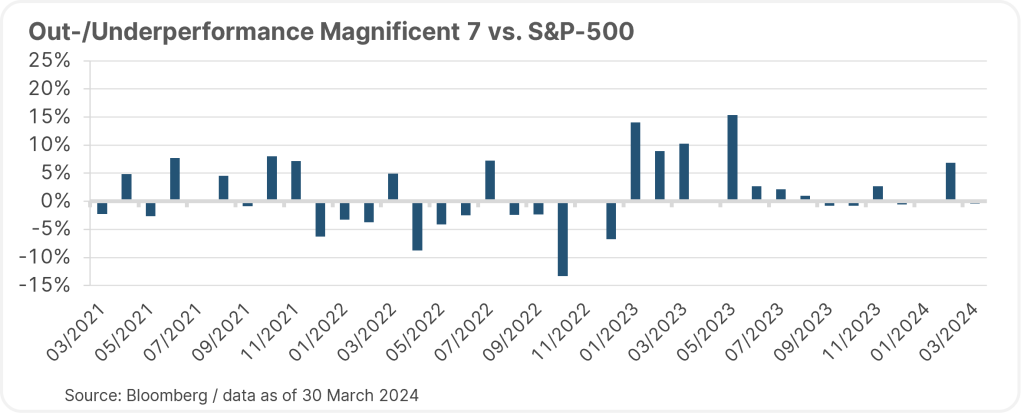 The chart below, for example, shows the monthly performance differences of the Magnificent 7 (Apple, Amazon, Alphabet, Meta, Microsoft, Nvidia, and Tesla) compared to the broad S&P 500 share index. As is easy to see, the technology-heavy index heavyweights continue to perform solidly, but the massive outperformance appears to be over for the time being. In some cases, this has even reversed – Tesla, for example, has shed more than 30% since the turn of the year, while Apple has also incurred a significant loss of more than 10%. The recovery in market breadth should also be seen as positive, as share prices now reflect the overall solid economic situation.