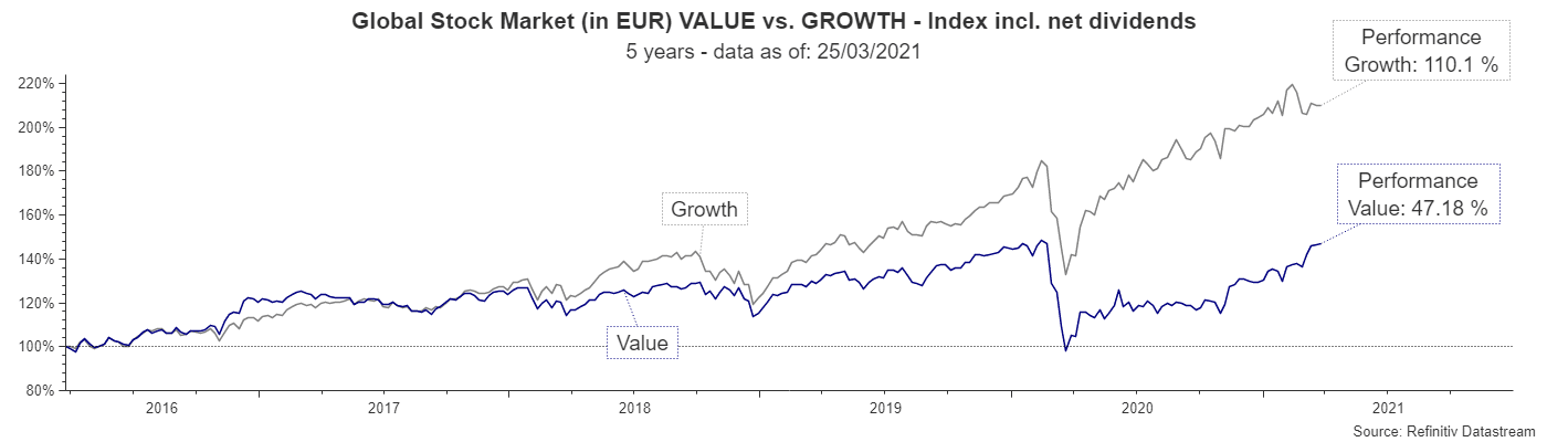 After many years of rising prices, a lot of investors are mainly invested in Growth and the story behind it. In the wake of the corona crisis, many companies have had to cut or even suspend their dividend payments from March 2020 onwards. This gave a further relative boost to Growth, putting Value thoroughly out of fashion.