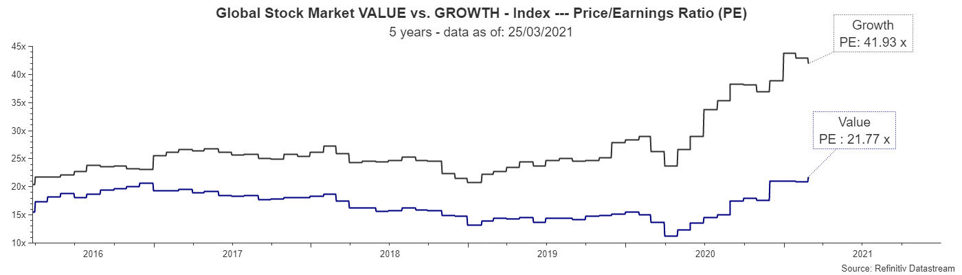 Chart 2: Global equity market Value vs. Growth PER 5Y, Source: Refinitiv Datastream, data as of 25 March 2021