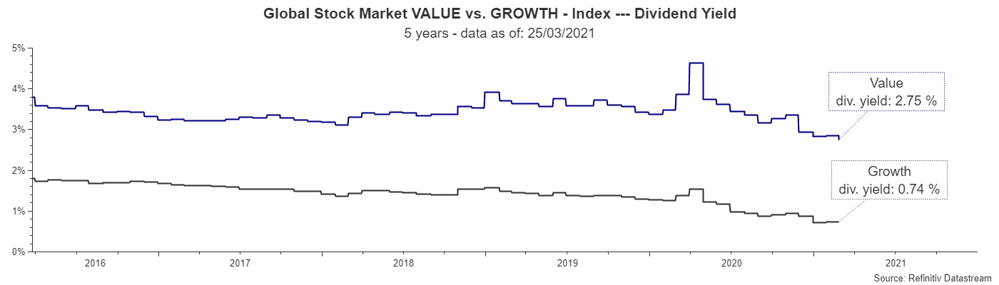 Chart 3: Global equity market Value vs. Growth, dividend yield 5Y, Source: Refinitiv Datastream, data as of 25 March 2021