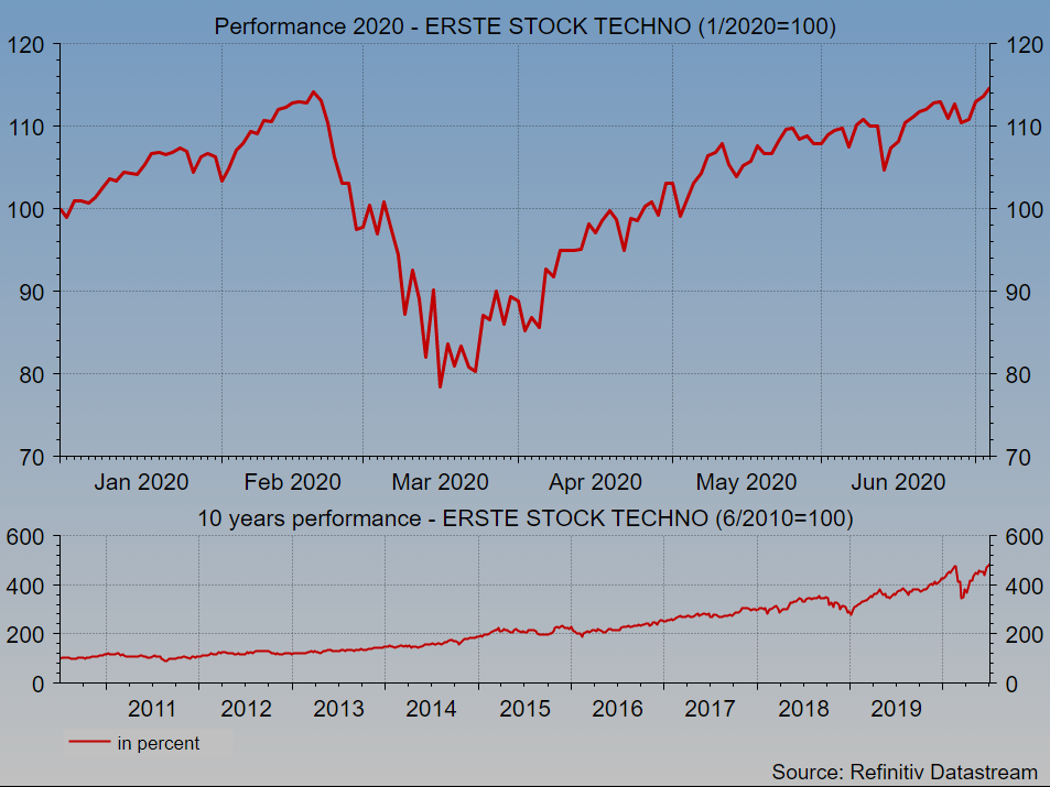 The technology equity fund ERSTE STOCK TECHNO <Achtung: deutscher Link> (please refer to the chart below) reflects the success story of technology shares in the recent decade. The fund management team focuses on high-quality, high-growth companies, the majority of which are based in the USA. The investment process takes into account environmental, social, and governance factors.
