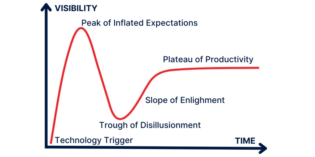 If we look at the monthly user accesses to the ChatGPT website, the peak of euphoria seems to have been passed in May 2023 with 1.9 billion visitors. In August, the number of users had already “shrunk” to only 1.6 billion. According to the hype cycle model developed by Gartner Research for new technologies, the “peak of inflated expectations” is followed by the “trough of disillusionment,” where many of the lofty promises turn out to be pipe dreams and many users turn away from the technology. At the end of the hype cycle is the “plateau of productivity” – the phase in which a new technology can exploit its full potential.