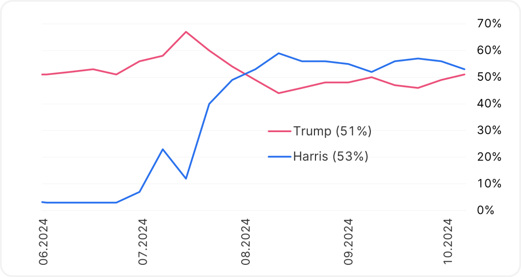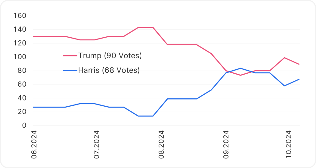 There are many polls and bookies where you can voice your opinion (and bet on it). This comes in the context of the fact that traditional telephone polling no longer produces the kind of forecasts in the internet age as they used to. We will use one of the polls here, which shows a varying but constant lead for Harris over the last two months: