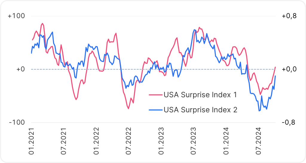 The “temperature” of the US economy can be measured not only in absolute terms, but also relatively: does new data come in above or below analysts’ expectations? This shows that the situation turned positive in September after a negative situation from June to August.