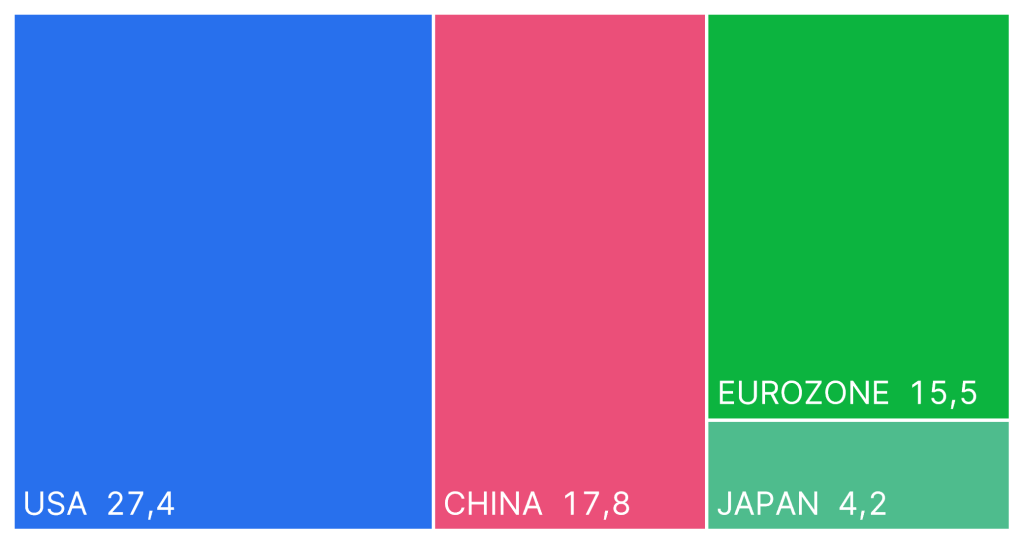 Finally, it is interesting to take a look at large economic areas. Just a few years ago, it was predicted that China would overtake the USA in the near future due to its even higher growth rates than the ones generated by the United States, which in turn has been growing faster than Europe for a long time (N.B. the weakening growth and low innovative strength in Europe are indeed becoming more and more of a cause for concern). Now, however, growth in China is slowing down, and so the USA’s global pole position seems to be secure for the time being.