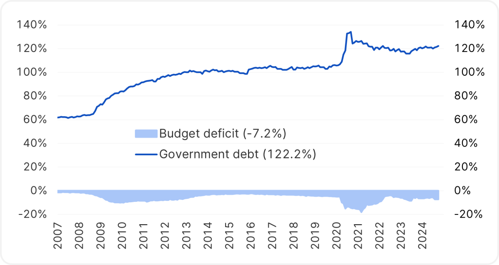 One issue that needs to be addressed for the future is the comparatively high budget deficit as compared to Europe, where a deficit of 3% is a customary assessment basis (which is sometimes better, sometimes less well met within the EU). In the USA, the deficit is currently 7.2%, as the following chart shows. On the other hand, national debt is relatively constant as measured against economic output, which is driven by consistently high growth.