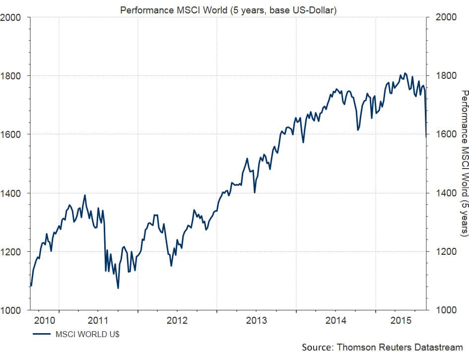 The most recent price declines were triggered by the devaluation of the Chinese currency relative to the US dollar of more than 4% on 11 August. The markets did not only see the positive effects such as the emancipation from the US central bank and from the US dollar and a more flexible currency but also the possible negative effects such as a devaluation race. The uncertainty alone over how much the renminbi will depreciate has caused depreciation pressure and actual depreciation among emerging markets currencies. At the moment the Chinese currency is about 3% below the exchange rate that had been set by the Chinese central bank on Friday. It would be a comforting signal if the central bank were to intervene and keep the exchange rate stable.