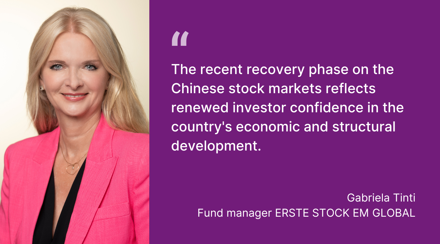 One of the reasons for the renewed strength of Chinese equities is likely to be its own population. “The recent recovery phase on the Chinese stock markets is an expression of renewed investor confidence in the country’s economic and structural development,” says Gabriela Tinti, fund manager at Erste Asset Management, describing the upswing in China.