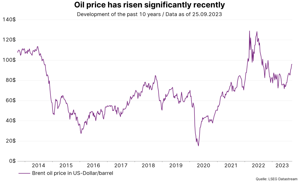 The Brent oil price has risen by around 30% since Q2. This can be attributed to a large extent to the OPEC+ production restrictions. However, the higher-than-expected US growth has only had a limited part in this. The negative supply-side shock reduces economic growth and increases inflation. However, so far there is little evidence of an impact.