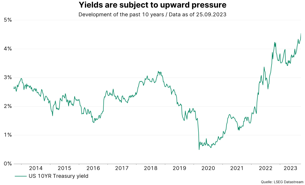 At 4.4%, the previous cyclical highs of October 2022 (4.2%) were exceeded. Those investors who are or were positioned for yield declines are thus under pressure to close their long positions. From a technical perspective, this reinforces the upward movement of yields. However, the most likely reason for the rise in yields are the signals sent by the central banks with regard to their battle against inflation in the developed economies. Last week, the most important central bank, the US Fed, left the range for the Fed funds rate unchanged at 5.25% to 5.5%, as had been widely expected.