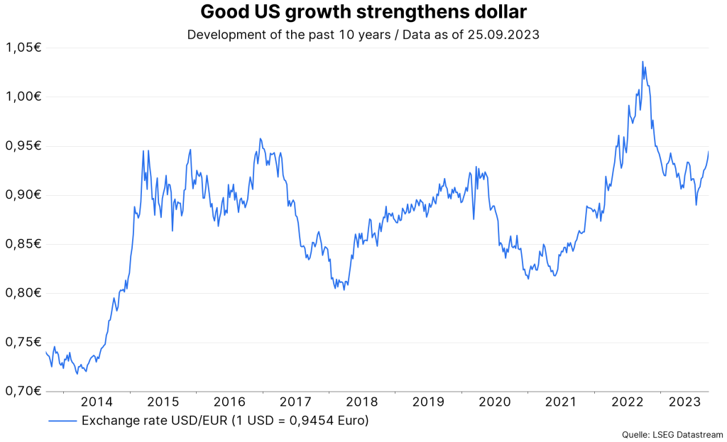 The strength of the US dollar is easily explained. Real GDP growth is significantly higher in the USA than in other regions. The Federal Reserve Bank of Atlanta’s model-based growth estimate for Q3 is 4.9% (quarter-on-quarter, annualised). That of the New York Fed is 2.1% and that of the St. Louis Fed 1.6%. The arithmetic mean of the three estimates is 2.9%, which is significantly higher than the estimates for the other regions. For example, growth in the Eurozone is likely to stagnate in Q3. In addition, the US dollar is inherently anti-cyclical: negative developments at the global level (growth slowdown, share price declines, geopolitical uncertainty) support the US dollar on average.