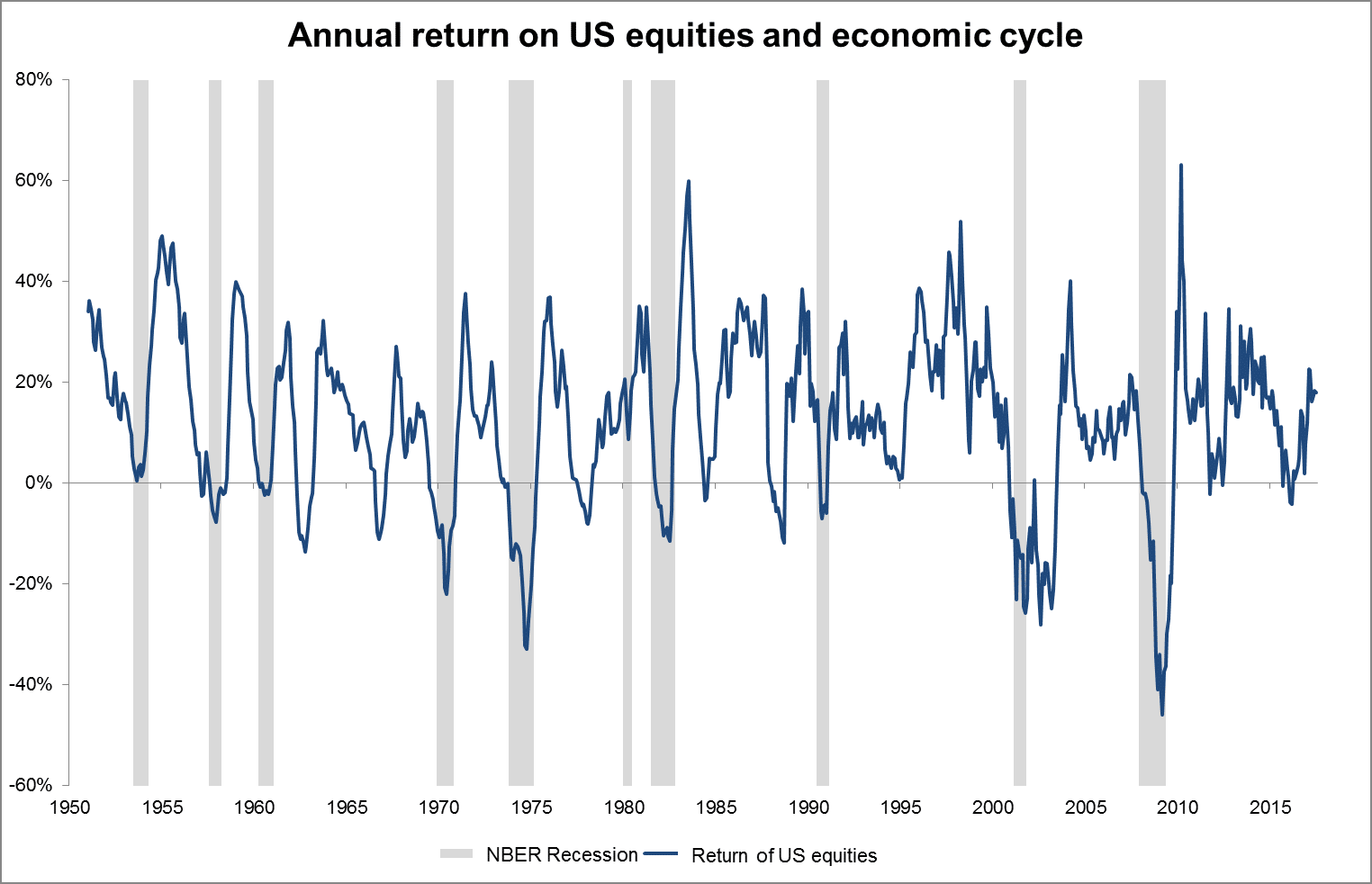 As far as the economic cycle is concerned, the following chart shows the phases of recession (grey shading) and the return on shares on a year-on-year basis. We believe there is a learning point in here as well. While not all phases of low equity return go hand in hand with a recession, all recessions are accompanied by a phase of weakness on the equity markets. Clearly, recessions are poison to the equity market.