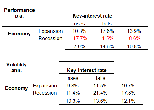 The picture is similar with respect to risk, albeit not as drastic. The outstanding period is the phase of recession combined with falling key-lending rates. This is the final phase of a recession, where the markets are bottoming out. As a result, the share returns turn from negative to positive, with occasional setbacks every time initial hopes are being disappointed. This is what leads to an extremely elevated level of volatility.