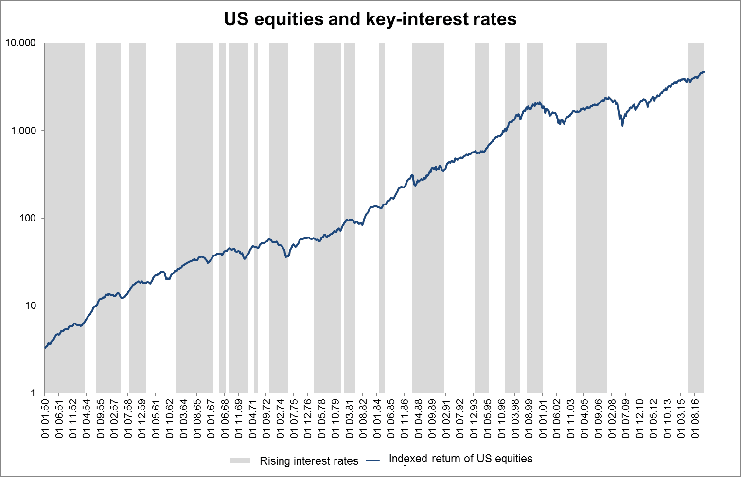 Every analyst knows that a report hinges on the visualisation of data, i.e. the eyeballing. Let’s eyeball. The following chart shows the S&P 500 index since 1950. The phases of interest rate increases are shaded grey. It seems to us that equities typically slump at the end of an interest rate increase cycle. This pattern is particularly clear during the phases of interest rate increases at the beginning of the data set. This is in line with theory: central banks step up rates as soon as the economy is picking up momentum. Or, like the former chairman of the Fed, William McChesney Martin, phrased it so poignantly: “The Fed’s job is to take away the punch bowl just as the party gets going.”