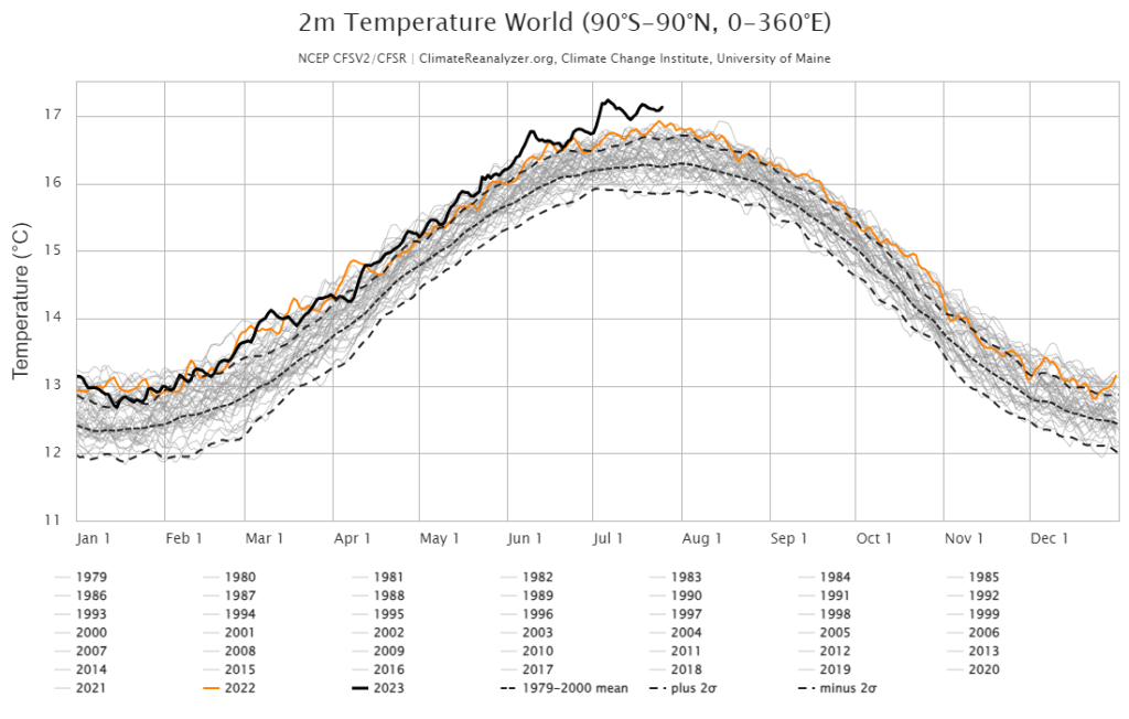 Daily global average air temperature over the past 40 years; Source: climatereanalyser.org, Climate Change Institute, University of Maine