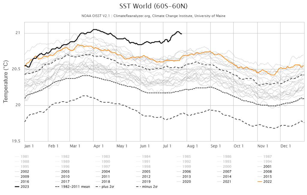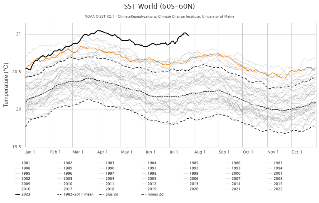 Many scientists around the world are currently dealing with an unusual anomaly. The water in the Atlantic is significantly warmer than it should be. So far, however, no one has found a reasonable explanation for this – there are assumptions, but nothing more.1 In general, the water temperature of the oceans is also significantly above the long-term average temperatures this year, as the following graph shows.
