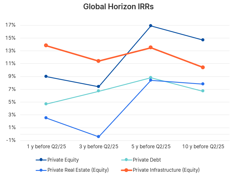 The historical performance of private infrastructure investments has been characterised by stable returns, with returns proving particularly impressive over long investment horizons. The chart below compares private infrastructure returns over various time periods with those of other private markets asset classes.