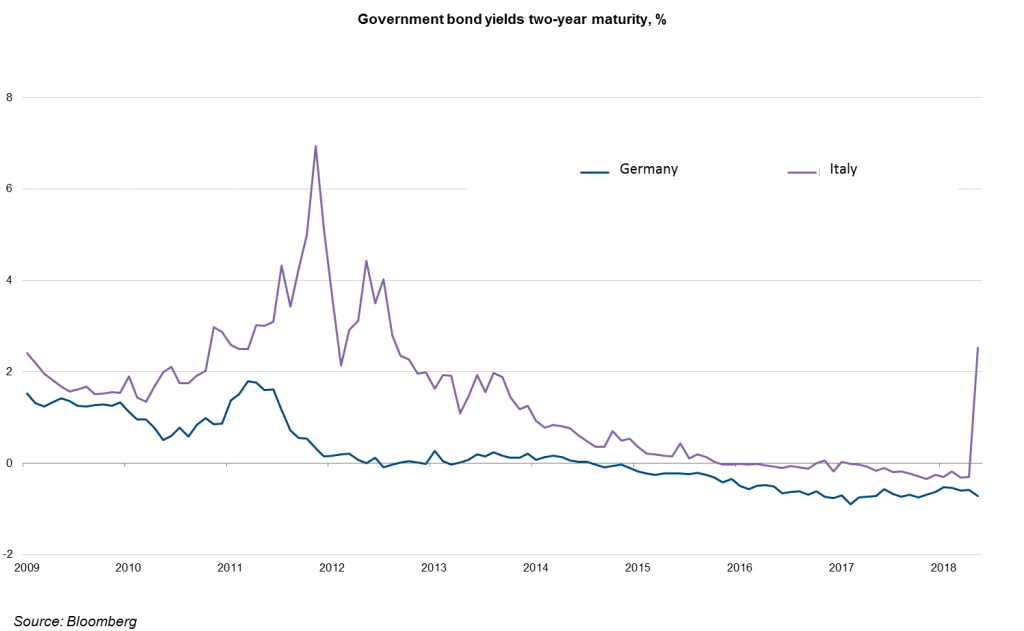The heightened uncertainty over whether Italy will repay its debts and whether it will remain a member of the eurozone has led to a sell-off in securities. The key benchmark, the yield on two-year Italian government bonds, rose from minus 0.30% in early May to 2.50% on May 29 (source: Bloomberg).
