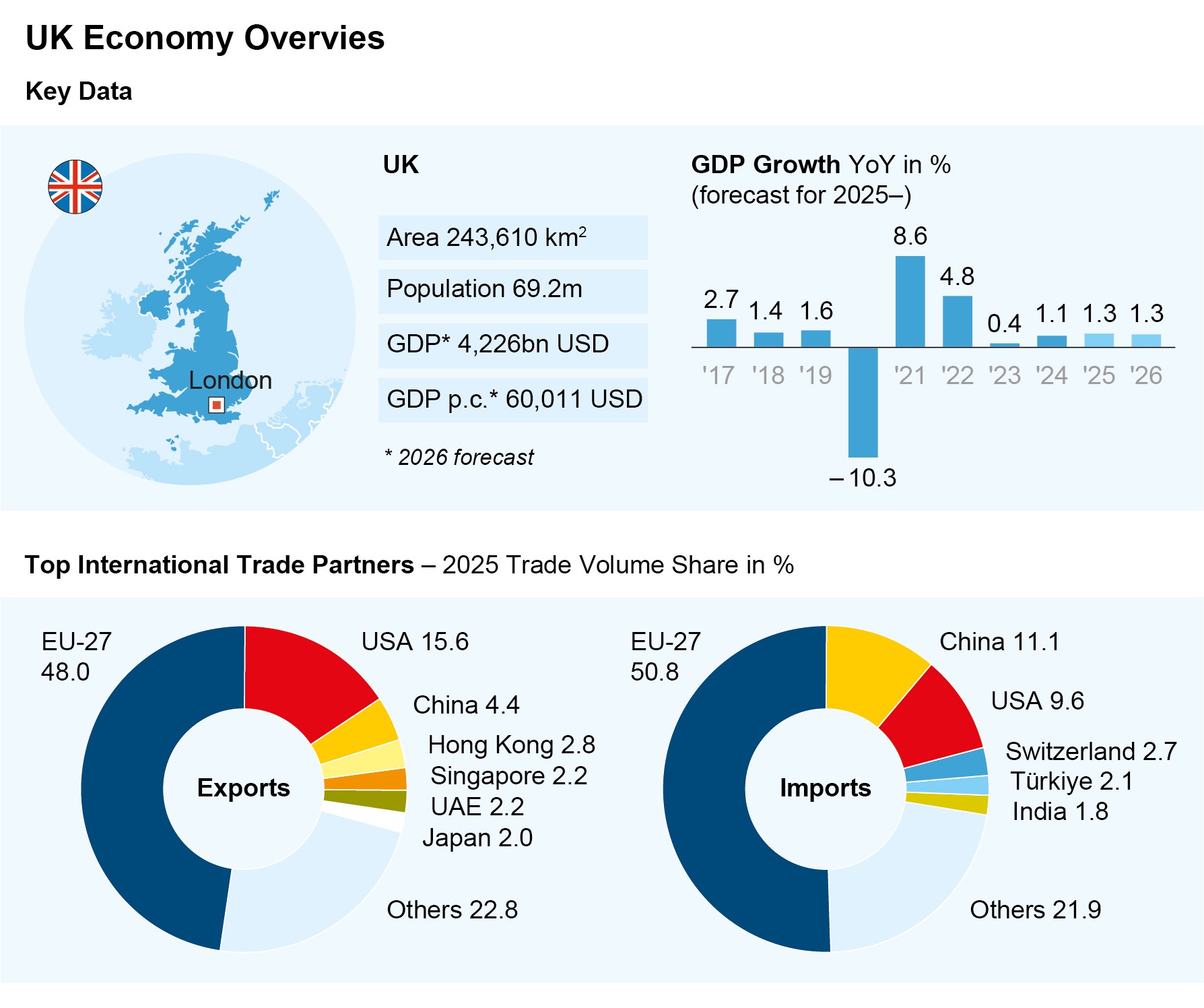 Experts also expect the UK economy to benefit further from its traditional ‘assets’. The country’s major strengths include its universities, research and development, and thus also ‘knowledge-based’ industries. British pharmaceutical giants AstraZeneca and GSK both work closely with research institutes at elite universities, and the country boasts a traditionally strong financial sector. Experts also consider many of the country’s small and medium-sized companies, known as ‘small caps’, to be well positioned, as they tend to be able to respond more flexibly to a rapidly changing industry environment. Note: The companies listed here have been selected as examples and do not constitute investment recommendations.