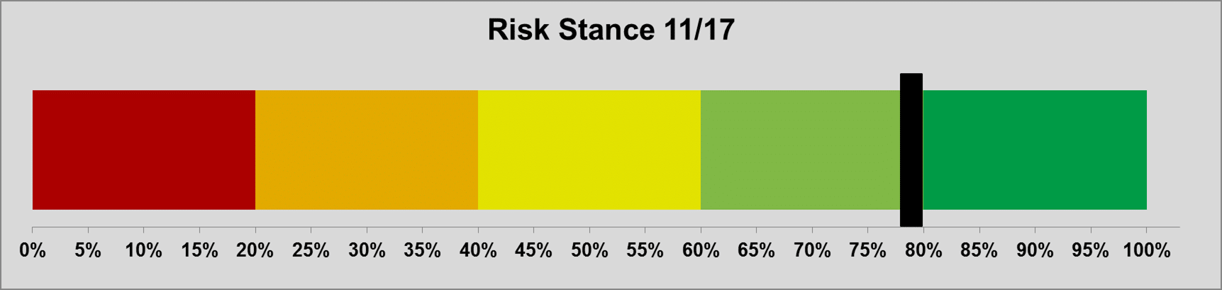 Our Risk Stance, i.e. the current risk appetite of our Committee, is very positive and also more positive than last month. Thus, we have seen an improved assessment of the environment for risky assets for the third consecutive time. However, the improvement was moderate. Two of the 13 members of the Committee were a notch riskier in their assessment. This is due to the fact that the economic environment remains very positive, which suggests investments in risky assets, while the political problems (North Korea, Catalonia) have declined over the past months.