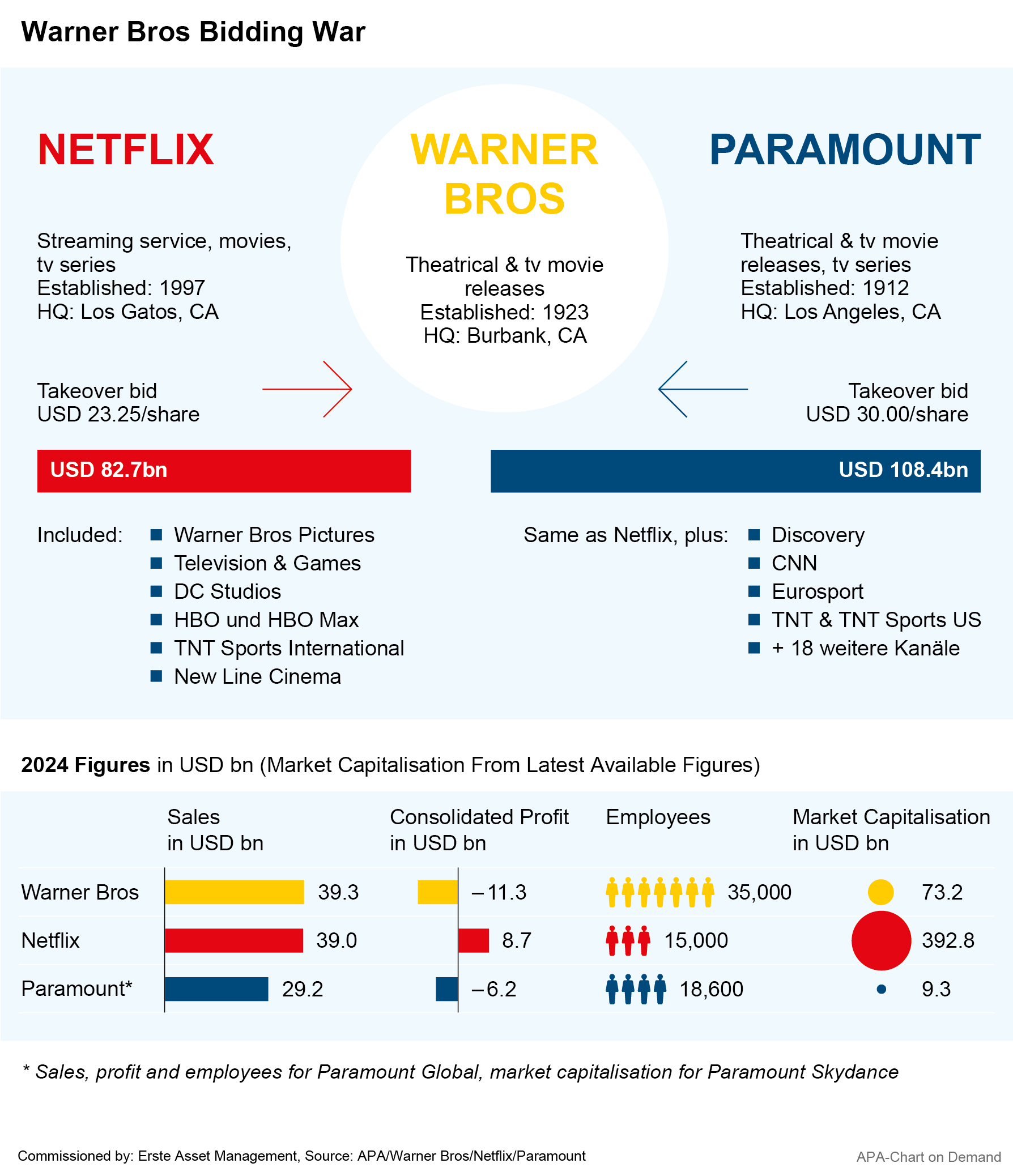 The bidding battle for the Warner Bros. Discovery media group has recently intensified further. After streaming provider Netflix recently reached an agreement with Warner Bros. to take over large parts of the group for USD 83 billion, fellow bidder Paramount is now making a hostile counteroffer directly to shareholders.
