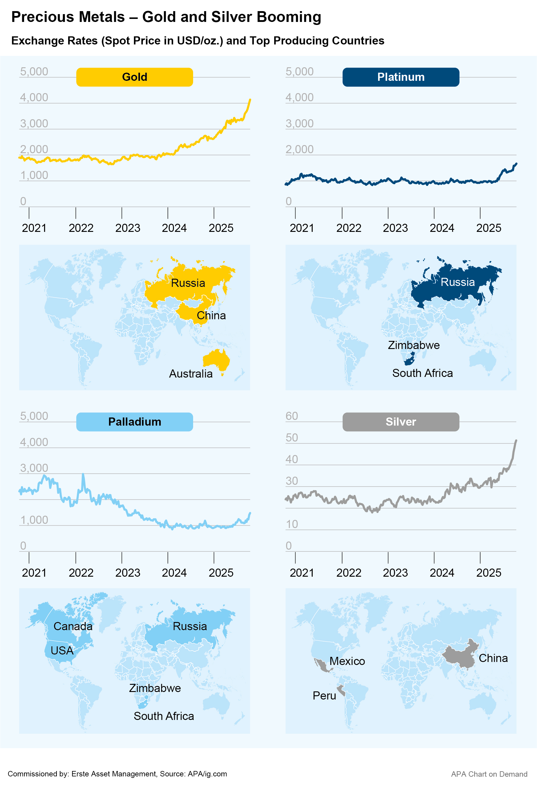 The recent rally in precious metal prices has not only pushed the price of gold to new record highs. Silver recently reached a new all-time high of over USD 53 per ounce, an increase of around 80 per cent since the start of the year, outperforming even gold’s impressive run.