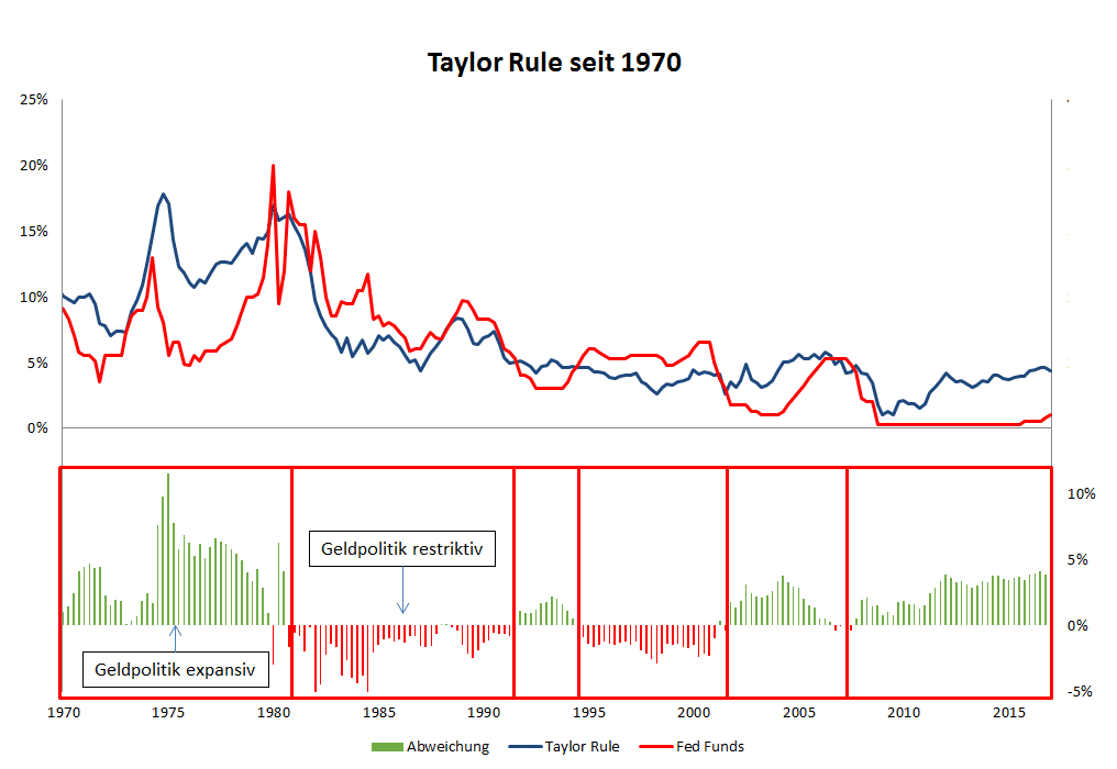 The so-called Taylor rule is an at least superficially simple tool for the analysis of this question. It was named after the well-known US economist John B. Taylor. Taylor is rumoured to be in with a chance of becoming the next chairman of the Fed (https://www.bloomberg.com/graphics/2017-who-will-be-the-next-fed-chair/). Prior to taking you through the analysis, we will quickly discuss the way the Taylor rule works. The concept was first created in the 1990s and is nowadays used in various forms.