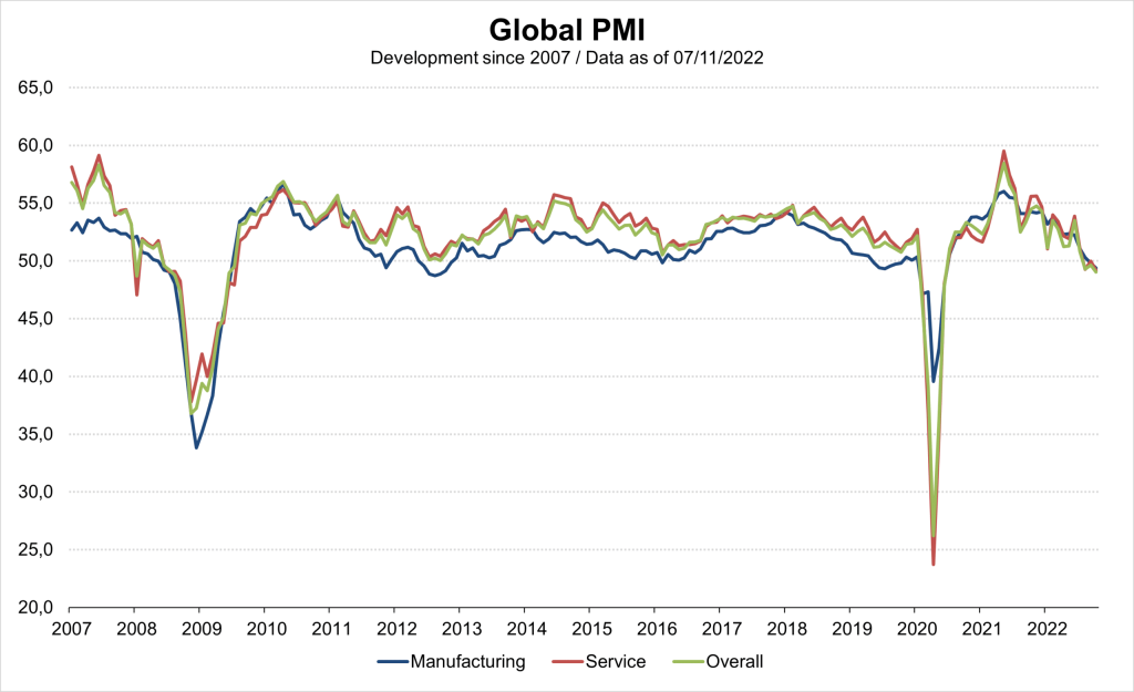 The majority of economic indicators are in line with weak real economic growth. However, the falling trend is worrying. For example, the global purchasing managers’ index also continued its falling trend in the month of October (49.0). The low level of new orders (49.1) points to weakening demand. The employment component (at 51.0) has also lost some of its strength in recent months. Unsurprisingly, the sentiment component has fallen further. After all, sales prices are also down. It is also noteworthy that both sectors (manufacturing: 49.4; services: 49.2) are losing momentum in numerous countries. Because the rapid, strong and synchronous increases in key interest rates and the higher cost of capital are only reaching the real economy with a time lag, a further weakening of economic activity is likely. The risks of a global recession have increased.
