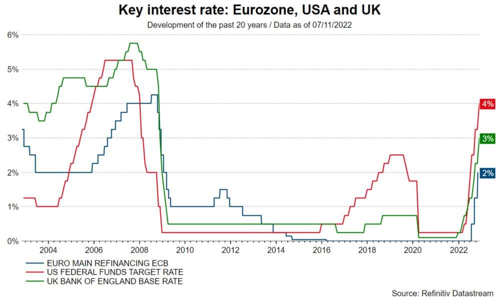 The US Federal Reserve provides a good example of this. Last week, the key interest rate (upper band) was raised from 3.25% to 4.0% in the USA, as generally expected. The statement on the interest rate decision talks about the fact that future decisions will also take into account the interest rate hikes that have been made so far and the time-lagged effect of monetary policy on the real economy. This provides a hint for a December rate hike from 4.0% to 4.5%. However, in the press conference, Chairman Powell opined that data suggest a higher end point for rate hikes than originally thought (in September). This points to a key interest rate level of at least 5% in the first quarter.