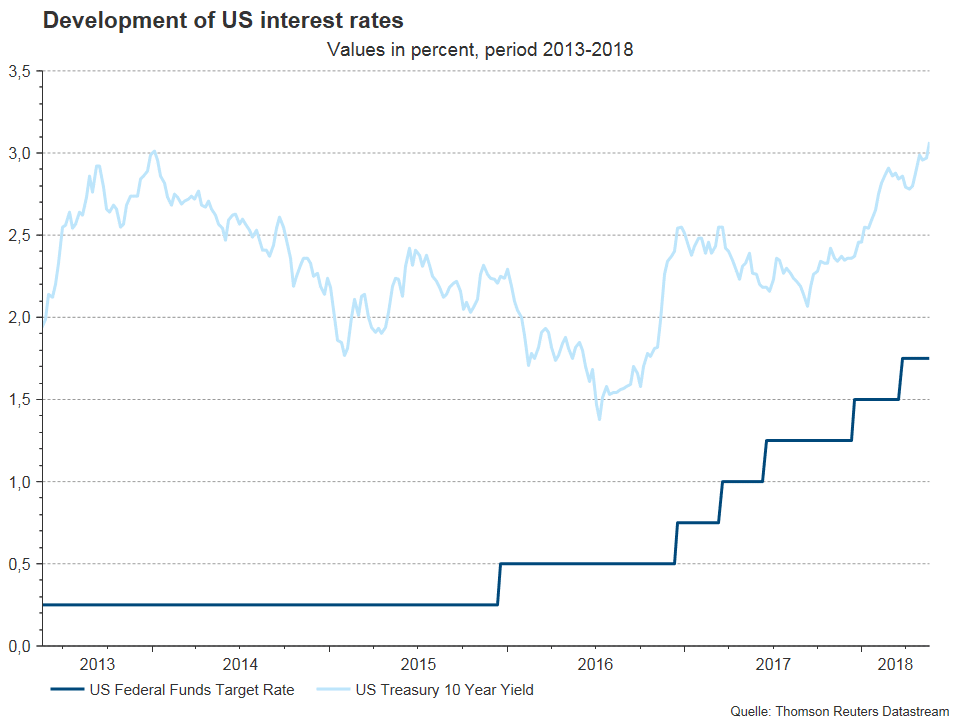 The real neutral interest rate is estimated to amount to 0.45% in the USA (Laubach / Williams, Federal Reserve Bank of San Francisco. This is the interest rate that affects inflation neither in a dampening nor in a supporting fashion. By adding the inflation target of the Fed of 2%, we arrive at the nominal neutral interest rate of 2.45%. The Fed itself assumes a value of 2.9%, which it wants to reach by the end of 2019. A key-lending rate (i.e. Fed funds rate) of 2.7% is already priced in for the end of 2019. By comparison, the current Fed funds rate is within a target band of 1.50-1.75%. This means the majority of the expected rate hike is priced in. In terms of the important benchmark, the 10Y yield of the US Treasury bond, this means a stabilisation within a band of 3-3.25% (currently 3.07%; source: Bloomberg, as of 17 May 2018). This holds as long as inflation is not rising.