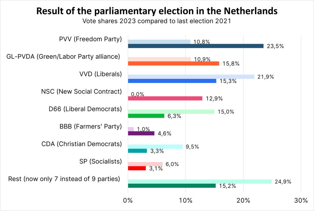 The even higher than expected share of the vote for the PVV, which is clearly the largest parliamentary group in the Netherlands with more than 23% (37 out of a total of 150 seats), caused a shock wave in the Netherlands. The shift towards populist parties illustrates the dissatisfaction of the Dutch with traditional politicians and the political responsibility of the government.