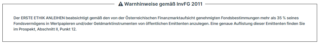 For further information on the sustainable focus of ERSTE ETHIK ANLEIHEN as well as on the disclosures in accordance with the Disclosure Regulation (Regulation (EU) 2019/2088) and the Taxonomy Regulation (Regulation (EU) 2020/852), please refer to the current Prospectus, section 12 and the Annex “Sustainability Principles”. In deciding to invest in ERSTE ETHIK ANLEIHEN, consideration should be given to any characteristics or objectives of the ERSTE ETHIK ANLEIHEN as described in the Fund Documents.