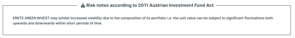 For further information on the sustainable focus of ERSTE GREEN INVEST as well as on the disclosures in accordance with the Disclosure Regulation (Regulation (EU) 2019/2088) and the Taxonomy Regulation (Regulation (EU) 2020/852), please refer to the current Prospectus, section 12 and the Annex “Sustainability Principles”. In deciding to invest in ERSTE GREEN INVEST, consideration should be given to any characteristics or objectives of the ERSTE GREEN INVEST as described in the Fund Documents.