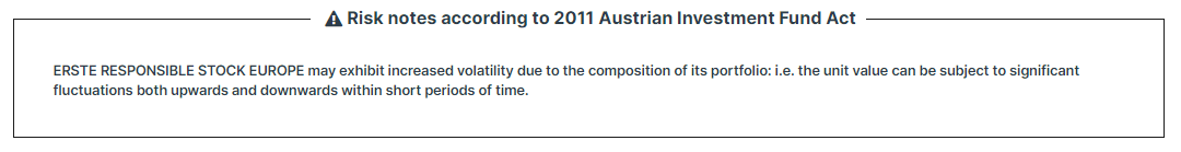For further information on the sustainable focus of ERSTE RESPONSIBLE STOCK EUROPE as well as on the disclosures in accordance with the Disclosure Regulation (Regulation (EU) 2019/2088) and the Taxonomy Regulation (Regulation (EU) 2020/852), please refer to the current Prospectus, section 12 and the Annex “Sustainability Principles”. In deciding to invest in ERSTE RESPONSIBLE STOCK EUROPE, consideration should be given to any characteristics or objectives of the ERSTE RESPONSIBLE STOCK EUROPE as described in the Fund Documents.