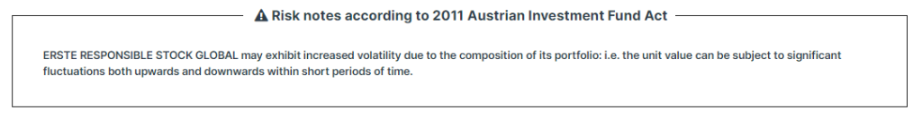 For further information on the sustainable focus of ERSTE RESPONSIBLE STOCK GLOBAL as well as on the disclosures in accordance with the Disclosure Regulation (Regulation (EU) 2019/2088) and the Taxonomy Regulation (Regulation (EU) 2020/852), please refer to the current Prospectus, section 12 and the Annex “Sustainability Principles”. In deciding to invest in ERSTE RESPONSIBLE STOCK GLOBAL, consideration should be given to any characteristics or objectives of the ERSTE RESPONSIBLE STOCK GLOBAL as described in the Fund Documents.