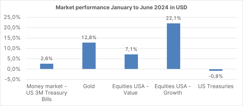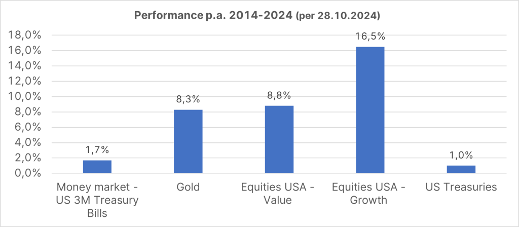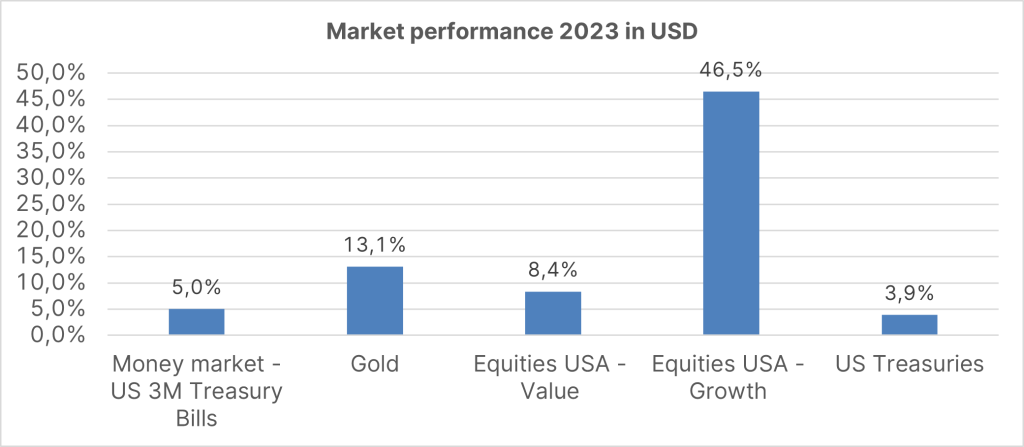 Source: LSEG Datastream; please note: equities USA – value = MSCI USA Value index, equities USA – growth = MSCI USA Growth index, money market = ICE Bofa US 3M Treasury Bill index, Treasury bonds = ICE BofA US Treasury & Agency index; indices displayed, no direct investment possible.