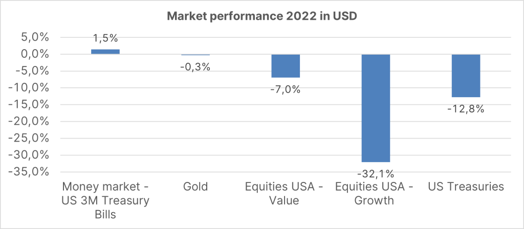 In 2022, we experienced an inflationary contraction in the USA. Inflation was high and continued to accelerate (from 7.5% to as high as 9.1%). In response, the US Federal Reserve raised key-lending rates massively (from 0.25% to 4.5%), which naturally had a severe impact on economic growth prospects.