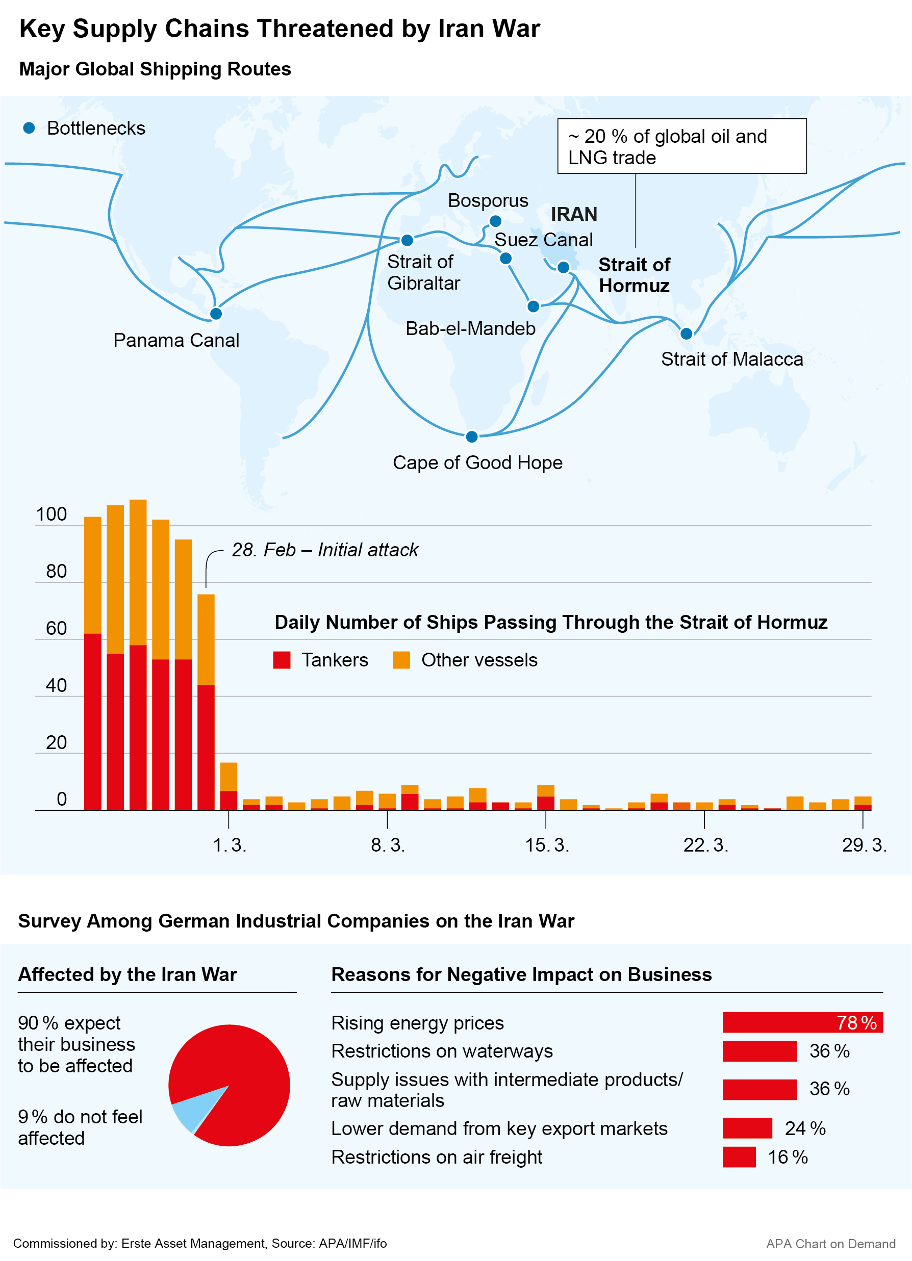 Nine out of ten industrial companies in Germany see their business negatively impacted by the Iran war, according to a recent survey by the German ifo Institute. Asked for the reason, 78 per cent of companies cited rising energy prices, 36 per cent per cent named restrictions on shipping routes, and 36 per cent named supply difficulties with intermediate goods and raw materials.