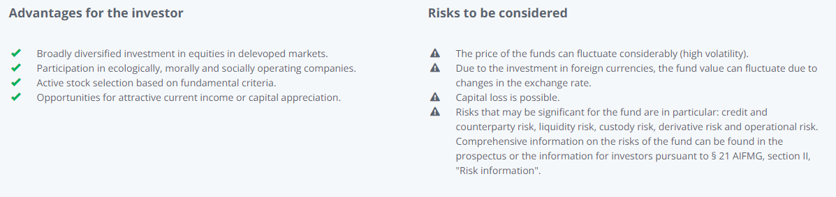 Please note: Investments in securities entail risks in addition to the opportunities presented here. The value of units and their earnings can rise and fall. Changes in exchange rates can also have a positive or negative effect on the value of an investment. For this reason, you may receive less than your originally invested amount when you redeem your units. Persons who are interested in purchasing units in investment funds are advised to read the current fund prospectus(es) and the Information for Investors pursuant to § 21 AIFMG, especially the risk notices they contain, before making an investment decision. If the fund currency is different than the investor’s home currency, changes in the relevant exchange rate can positively or negatively influence the value of the investment and the amount of the costs associated with the fund in the home currency.