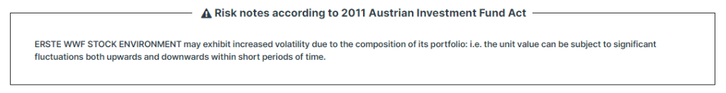 For further information on the sustainable focus of ERSTE WWF STOCK ENVIRONMENT as well as on the disclosures in accordance with the Disclosure Regulation (Regulation (EU) 2019/2088) and the Taxonomy Regulation (Regulation (EU) 2020/852), please refer to the current Prospectus, section 12 and the Annex “Sustainability Principles”. In deciding to invest in ERSTE WWF STOCK ENVIRONMENT, consideration should be given to any characteristics or objectives of the ERSTE WWF STOCK ENVIRONMENT as described in the Fund Documents.