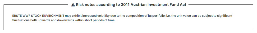 For further information on the sustainable focus of ERSTE WWF STOCK ENVIRONMENT as well as on the disclosures in accordance with the Disclosure Regulation (Regulation (EU) 2019/2088) and the Taxonomy Regulation (Regulation (EU) 2020/852), please refer to the current Prospectus, section 12 and the Annex “Sustainability Principles”. In deciding to invest in ERSTE WWF STOCK ENVIRONMENT, consideration should be given to any characteristics or objectives of the ERSTE WWF STOCK ENVIRONMENT as described in the Fund Documents.
