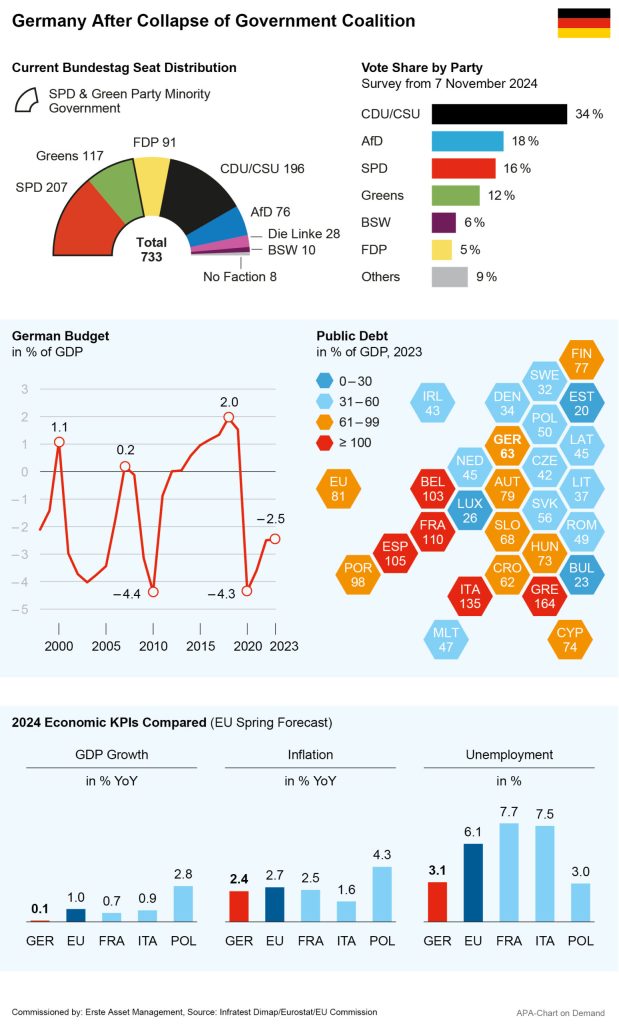The end of the coalition government in Germany is exacerbating the uncertainty for the struggling German economy – and at a time when new challenges are emerging for Europe’s largest economy following the US election. However, experts also see the upcoming change of government in Germany as an opportunity for realignment and necessary reforms.