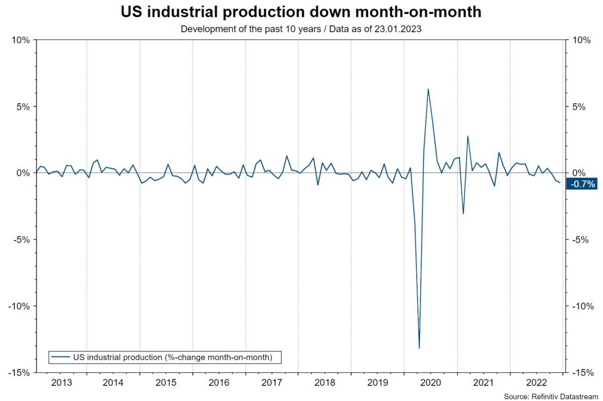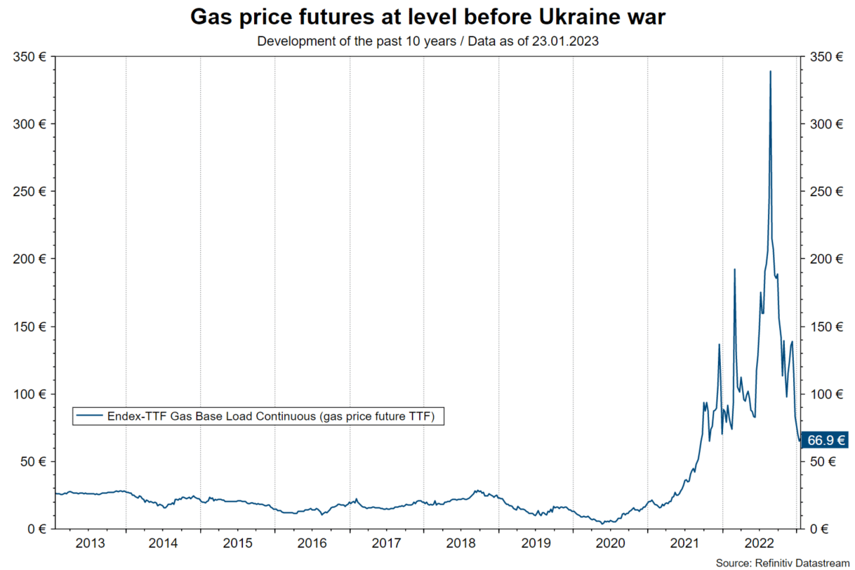 On the positive side, in Europe the rapid decline in energy prices and fiscal support measures have led to an improvement in economic indicators and estimates. Meanwhile, the key gas price futures TTF has fallen slightly below the level just before the invasion of Ukraine at EUR 67 / MWh. Evidence for slight real GDP growth in the first quarter after stagnation in the fourth quarter of 2022 is growing. At the end of 2022, a technical recession had still been assumed (GDP contraction for two quarters in a row). This positive development was supported by the ZEW economic barometer for the month of January. The expectations component for Germany has now risen for the fourth time in a row.