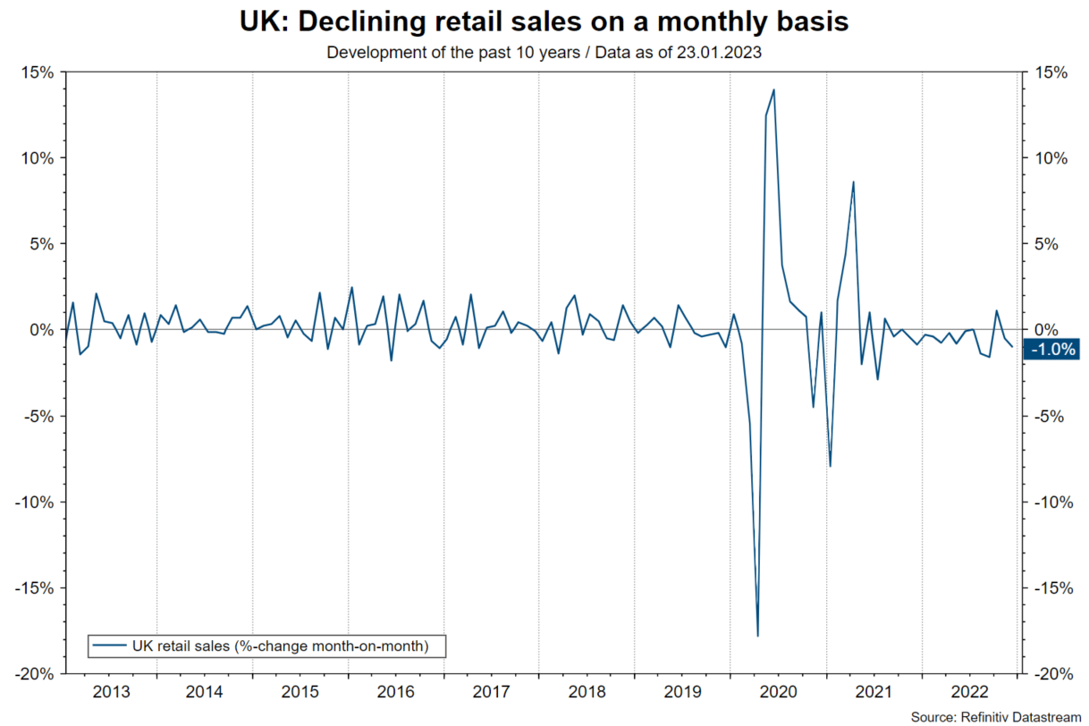 Retail sales in the UK also fell in the month of December. In addition, goods exports in the East Asian region – a barometer for global manufacturing – show a strong downward trend. Similarly, real estate indicators remained negative in the USA (building permits, housing starts, sentiment), China (falling prices) and the UK (falling prices).