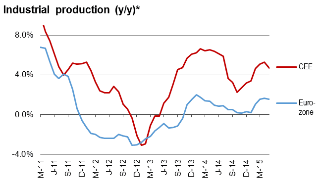- Growth has been robust: Industrial production in the region continues growing twice as fast as in the Eurozone. Also manufacturing PMIs, which were 1.5-3 percentage points higher in CEE than in Western Europe in recent months, confirm that CEE economies are outgrowing their western European peers. The consensus outlook for the Eurozone suggests that economic growth will reaccelerate in the course of the year, thus providing support for CEE.