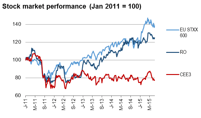 In searching for a perfect example of a sideways market one does not need to look further than at Central and Eastern European (CEE) equity markets. The CECE Composite, a Euro-based index of 23 Polish, Czech and Hungarian blue-chips (Bloomberg: CECEEUR), has been range bound for nearly four years, rarely trading outside a narrow range of ±8% from its mean over the period. A recent spike by 23% that started in January and lifted the index beyond this trading range was halted by the escalation of Greece-related risks. The only market in the region that has participated in the broader equity rally in Europe and the US in recent years has been the Romanian market.