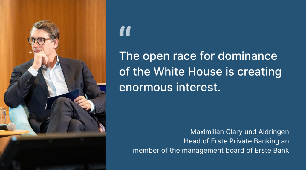 Reason enough to dedicate the Erste.Investment.Forum 2024 entirely to the race for hegemony in the United States. Maximilian Clary und Aldringen, Head of Erste Private Banking and member of the management board of Erste Bank in charge of the retail customer segment, invited the journalist and author Hannelore Veit and Gerold Permoser, Chief Investment Officer at Erste Asset Management, to speak on 1 October. In addition to the political background, the question also arose as to how the election of Trump or Harris would affect the equity market and investments.