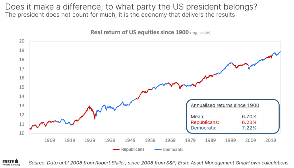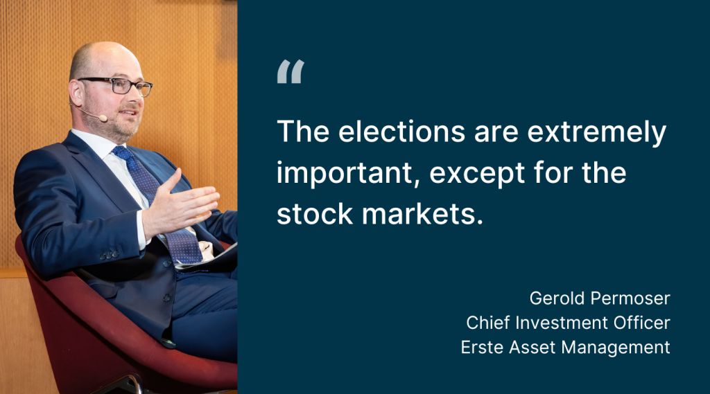 For Gerold Permoser, Chief Investment Officer at Erste Asset Management, the elections are “extremely important”, but not for the financial markets. Using the example of a long-running chart since 1900, he showed the audience that the US equity market had always risen in the long term under both a Democratic and a Republican president.
