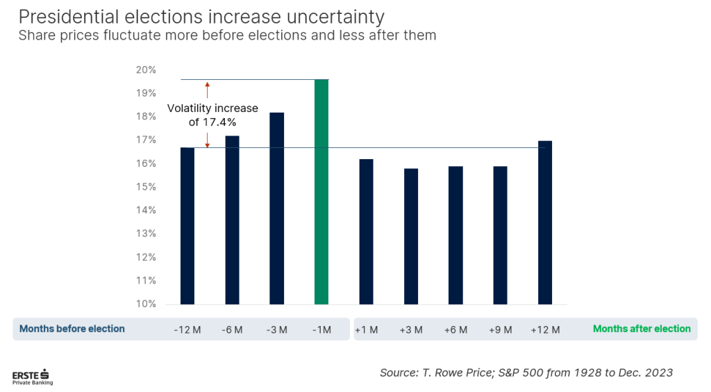 Volatility, a measure of price fluctuations, did increase around elections, but would fall again shortly after the election. The key question for Permoser is how growth will develop after the elections. Fund managers rarely position themselves directly on the outcome of elections. Elections are too information-efficient for that. You can’t find information that allows you to predict elections better than what is publicly available. In addition, politicians’ campaign promises are not implemented 1:1, and there are often unintended consequences or even the opposite of the intended result: for example, under Trump, alternative energies boomed, while under Biden, oil and gas companies experienced a boost.